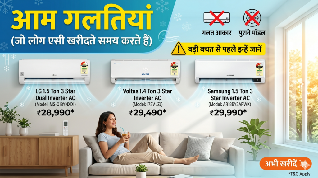 AC Under 30000 150-180 sq ft bedroom/living room वालों के लिए 5-Star mandatory। North India (Delhi-NCR, UP) extreme heat priority।