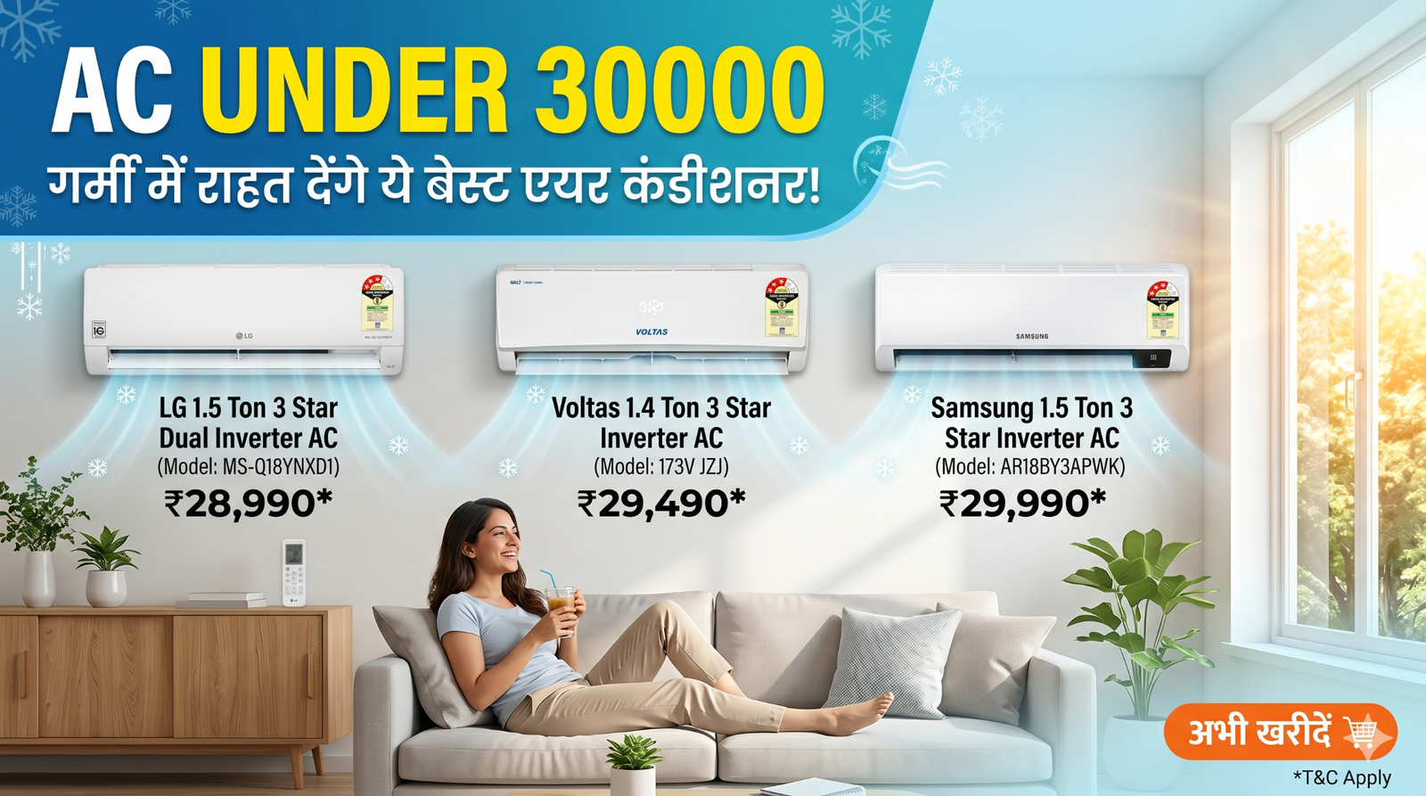 AC Under 30000: ₹30,000 के बजट में बेस्ट एयर कंडीशनर ढूंढ रहे हैं? अप्रैल 2026 में LG TS-Q19YNZE, Carrier Ester Neo, Godrej AC 1.5T 5-Star टॉप पिक्स हैं। इस आर्टिकल में cooling capacity, ISEER rating, energy bill calculation, installation process और long-term value सब practically समझाया है। गर्मी में 45°C पर reliable cooling।