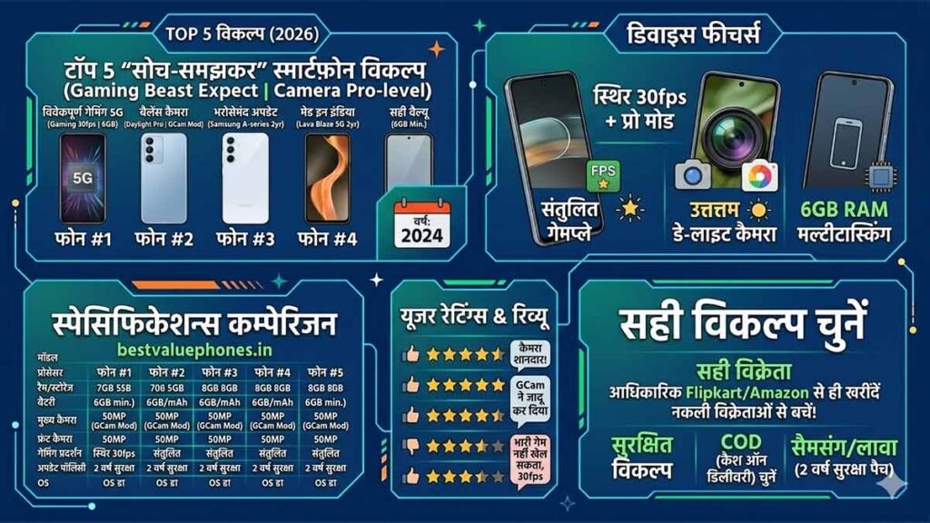 - बजट और नीड्स डिफाइन: ₹8k-10k सेट। Gaming? POCO M6। Battery? Lava Bold। Flipkart/Amazon price compare।