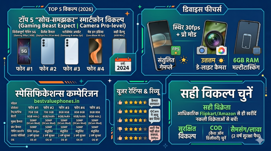 टॉप 3: Lava Bold (battery king), Samsung M06 (updates), POCO M6 (perf)। 10000 से कम में Best 5G Phone 2026 में ये reliable।