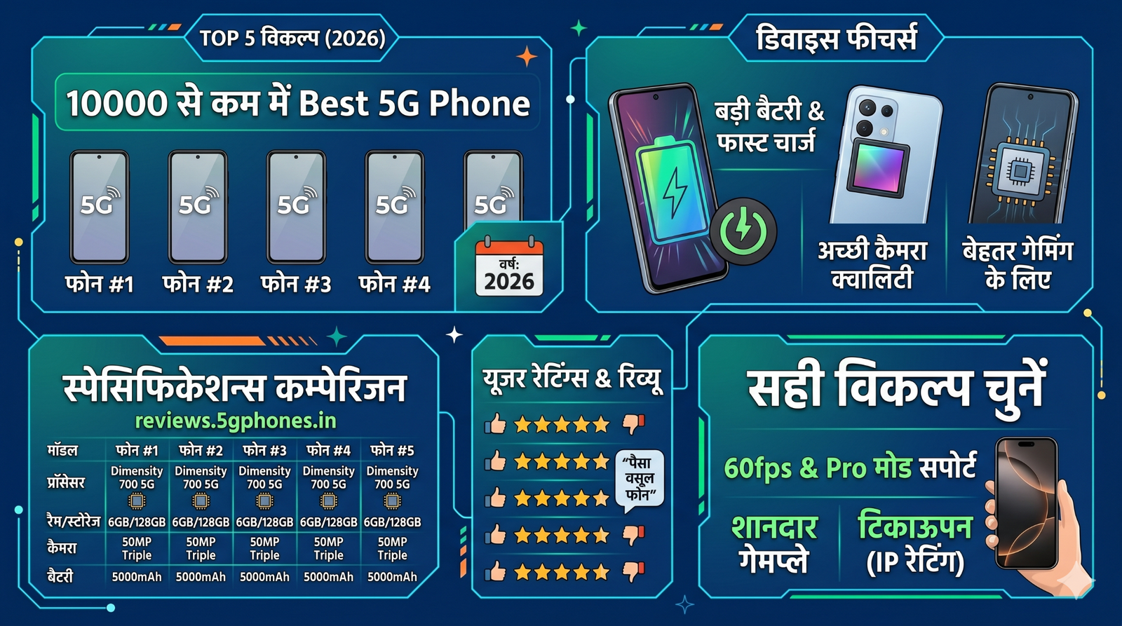 Best 5G Phone 2026: ₹10,000 से कम में बेस्ट 5G फोन ढूंढ रहे हैं? अप्रैल 2026 में ये बजट सेगमेंट में Lava Bold N1 5G, Samsung Galaxy M06 5G, POCO M6 5G जैसे ऑप्शन्स हैं। इस आर्टिकल में टॉप 5 फोन्स की स्पेक्स, प्रोस-कॉन्स, परफॉर्मेंस डेटा और खरीदने के फैसले सब मिलेंगे। 91mobiles और Smartprix जैसे सोर्सेज से वेरिफाइड।