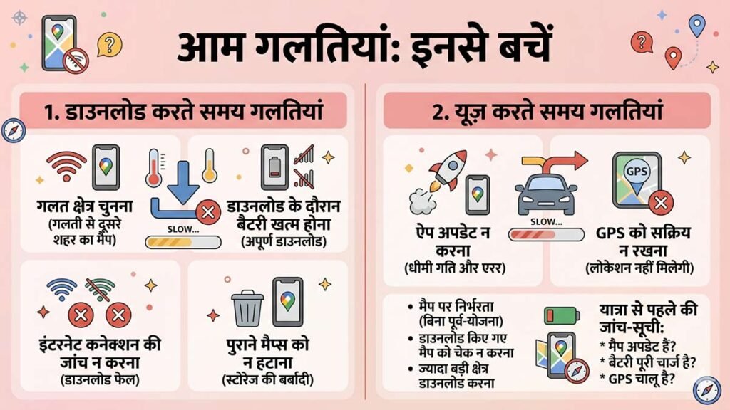 कुछ इलाके डाउनलोड नहीं (कॉन्ट्रैक्ट रूल्स)। ज्यादातर लोग स्टोरेज चेक भूलते। बजट फोन पर SD कार्ड यूज। मेरा रेकमेंडेशन: WiFi पर डाउनलोड, डेटा बचाएं। सर्विस सेंटर नहीं, खुद करें।