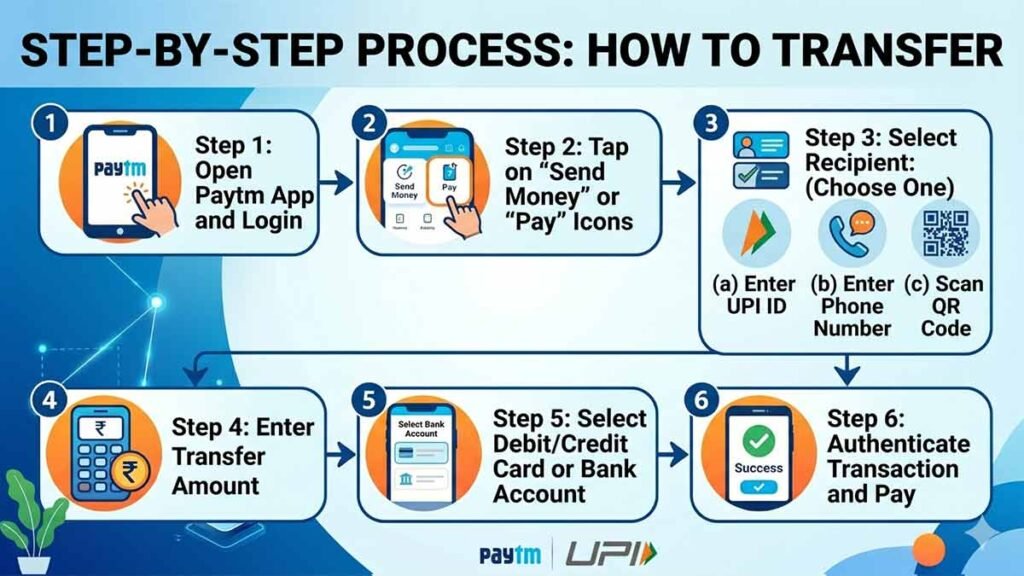 Paytm से पैसे ट्रांसफर का मतलब है Paytm ऐप के जरिए किसी के मोबाइल नंबर, UPI ID या बैंक अकाउंट पर तुरंत पैसे भेजना। यह UPI (Unified Payments Interface) पर चलता है, जो NPCI द्वारा बनाया गया है और 24/7 काम करता है।