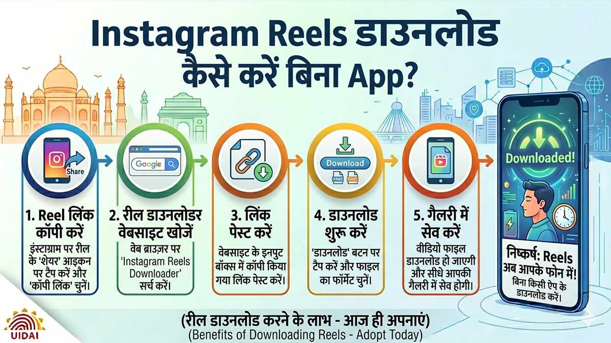 Reel अच्छा लगा लेकिन शेयर नहीं कर पा रहे या सेव नहीं हो रहा? Instagram Reels डाउनलोड कैसे करें बिना किसी App के, यह गाइड ब्राउज़र बुकमार्क और वेबसाइट तरीके देगी। कोई थर्ड-पार्टी सॉफ्टवेयर नहीं, सिर्फ copy-paste। Android, iPhone, PC सब पर काम करेगा। 2 मिनट में Reel आपकी गैलरी में।