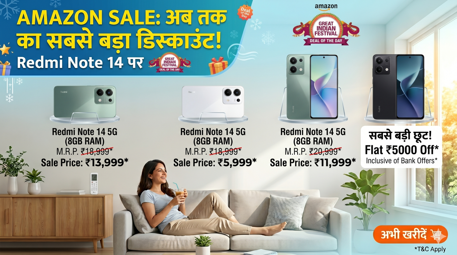 Amazon Sale का Redmi Note 14 डिस्काउंट Great Summer Sale 2026 का हिस्सा है, 15-22 अप्रैल तक। लॉन्च प्राइस ₹19,999 से अब ₹14,999 (₹5,000 off), प्लस ₹2,000 HDFC CB। Prime मेंबर्स को early access।