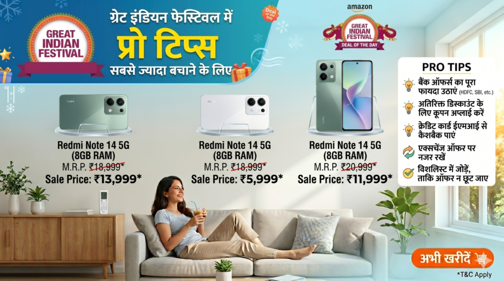 Amazon Great Summer Sale में Redmi Note 14 पर सबसे बड़ा डिस्काउंट ढूंढ रहे हैं? अप्रैल 2026 की ये सेल में 8/256GB वेरिएंट ₹14,999 पर उपलब्ध (लॉन्च ₹19,999 से 25% off)। इस आर्टिकल में डिस्काउंट डिटेल्स, फोन स्पेक्स, ऑफर्स, EMI स्टेप्स और वैल्यू चेक सब मिलेगा। GSMArena और 91mobiles से वेरिफाइड।