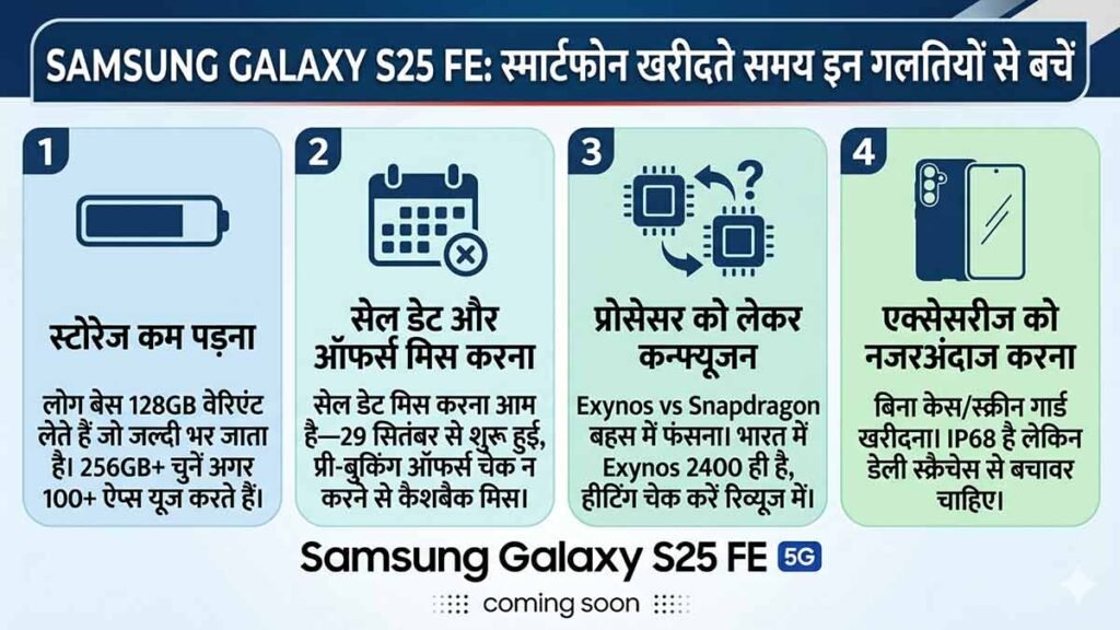 - ऑफिशियल चेक करें: Samsung.com/in या Amazon, Flipkart पर “Galaxy S25 FE” सर्च करें। लॉन्च 15 सितंबर 2025 भारत में, सेल 29 सितंबर से । वेरिएंट चुनें: 8GB/128GB (₹50,198), 256GB (₹58,290), 512GB (₹65,999-71,999) ।