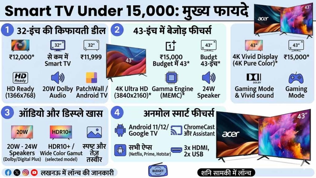 Smart TV Under 15000: ₹15,000 में स्मार्ट टीवी ढूंढ रहे हैं? अप्रैल 2026 में Motorola EnvisionX Jungle 32″ FHD (₹11,999), Thomson Phoenix 43″ 4K (₹14,999), Blaupunkt SBA10 40″ 4K (₹13,499) टॉप हैं। इस आर्टिकल में picture quality tests, app performance, sound output, installation steps और real-user feedback सब मिलेगा। घर में Netflix, Prime theater experience।